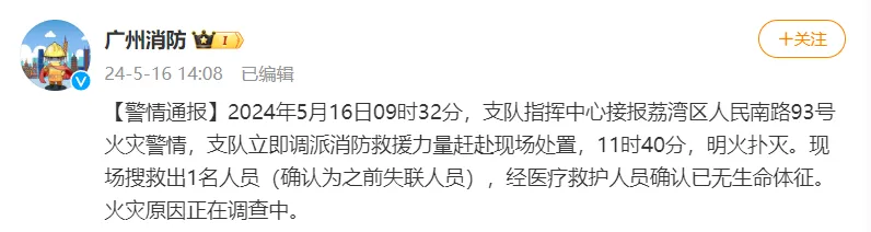5月16日,广东省广州市荔湾区人民南路93号火灾警情,据广州市消防救援支队消息,截至当日11时40分,明火已被扑灭。