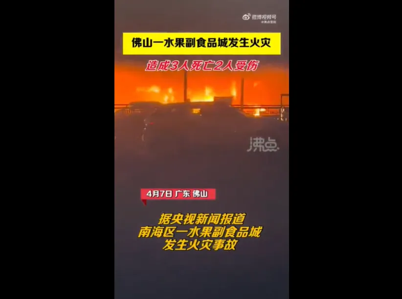 2022年4月7日凌晨1时许,广东省佛山市南海区狮山镇罗村华南水果副食品城发生火灾事故。事故共造成3人死亡,2人受伤。